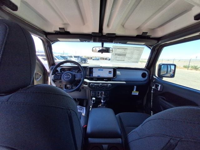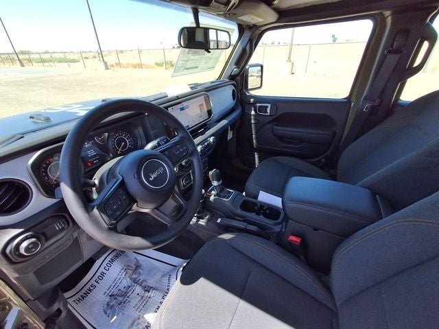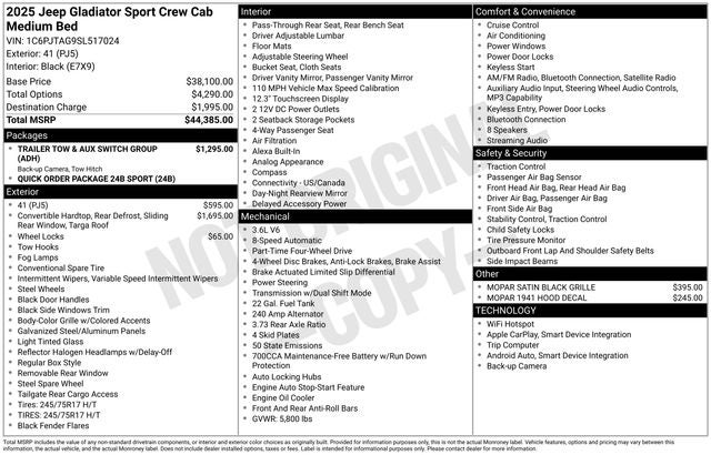 This Jeep Gladiator is equipped with the following features: Quick Order Package 24B Sport, Trailer Tow & Aux Switch Group (Auxiliary Switches, Class IV Receiver Hitch, Heavy-Duty Engine Cooling, and Trailer Hitch Zoom), 110 MPH Vehicle Max Speed Calibration, 12.3 Touchscreen Display, 3.73 Rear Axle Ratio, 4-Wheel Disc Brakes, 4G LTE Wi-Fi Hot Spot, 8 Speakers, ABS brakes, Air Conditioning, Alexa Built-In, AM/FM radio: SiriusXM, Apple CarPlay, Apple CarPlay/Android Auto, Black 3-Piece Hard Top, Brake assist, Cloth Low-Back Bucket Seats, Compass, Connectivity - US/Canada, Delay-off headlights, Driver door bin, Driver vanity mirror, Dual front impact airbags, Dual front side impact airbags, Electronic Stability Control, Freedom Panel Storage Bag, Front anti-roll bar, Front Bucket Seats, Front Center Armrest w/Storage, Front fog lights, Front reading lights, Google Android Auto, Illuminated entry, Integrated roll-over protection, Low tire pressure warning, MOPAR 1941 Hood Decal, MOPAR Satin Black Grille, Normal Duty Suspension, Occupant sensing airbag, Outside temperature display, Overhead airbag, Panic alarm, ParkView Rear Back-Up Camera, Passenger door bin, Passenger vanity mirror, Power steering, Power windows, Radio data system, Radio: Uconnect 5 w/12.3 Display, Rear anti-roll bar, Rear reading lights, Rear Sliding Window, Rear Window Defroster, Remote keyless entry, Speed control, Split folding rear seat, Steering wheel mounted audio controls, Tachometer, Telescoping steering wheel, Tilt steering wheel, Traction control, Trip computer, USB Host Flip, Variably intermittent wipers, Voltmeter, and Wheels: 17 x 7.5 Black Steel Styled.