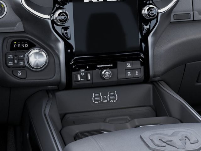 This Ram 1500 is equipped with the following features: Bed Utility Group (Exterior 115V AC Outlet, MOPAR 4 Adjustable Cargo Tie-Down Hooks, and MOPAR Spray in Bedliner), Laramie Level 1 Equipment Group (Rain Sensitive Windshield Wipers and Remote Tailgate Release), Night Edition (Accent Color Door Handles, Accent Color Premium Power Mirrors, Accent Color Tailgate Handle, Anti-Spin Differential Rear Axle, Auto Power-Folding Mirrors, Auto-Dimming Exterior Driver Mirror, Black Exterior Truck Badging, Black Headlamp Bezels, Black Interior Accents, Black Painted Exterior Mirrors Caps, Black Tail Lamp Bezels, Body Color Front Bumper, Body Color Rear Bumper with Step Pads, Convex Wide-Angle Exterior Mirror Insert, Dual Exhaust with Black Tips, Exterior Mirrors Approach Lamps, Exterior Mirrors Courtesy Lamps, Exterior Mirrors with Heating Element, Exterior Mirrors with Memory, Exterior Mirrors with Supplemental Signals, Grille Surround 3 Black Texture 2 Black, Pirelli Brand Tires, Proximity Approach/Departure Lamps, RAM Grille Badge - Black, Sport Performance Hood, and Wheels: 22 x 9 Forged Aluminum), Quick Order Package 27H Laramie, Trailer Tow Group (Trailer Brake Control, Trailer Reverse Steering Control, and Trailer Tire Pressure Monitoring System), 10 Speakers, 4-Wheel Disc Brakes, 4G LTE Wi-Fi Hot Spot, ABS brakes, Active Noise Control System, Adjustable pedals, Air Conditioning, Alloy wheels, AM/FM radio: SiriusXM with 360L, Apple CarPlay/Android Auto, Audio memory, Auto High-beam Headlights, Auto-dimming door mirrors, Auto-Dimming Exterior Passenger Mirror, Auto-dimming Rear-View mirror, Automatic temperature control, Black Exterior Mirrors, Black Power-Fold Trailer Tow Mirrors, Brake assist, Bumpers: chrome, Chrome Exterior Mirrors, Compass, Connected Travel and Traffic Services, Connectivity - US/Canada, Delay-off headlights, Driver door bin, Driver vanity mirror, Dual front impact airbags, Dual front side impact airbags, Electronic Stability Control, Forward and Reverse Utility Lights, Front anti-roll bar, Front Bucket Seats, Front Center Armrest w/Storage, Front dual zone A/C, Front fog lights, Front reading lights, Front wheel independent suspension, Fully automatic headlights, Garage door transmitter, GPS Navigation, Heated door mirrors, Heated front seats, Heated rear seats, Heated steering wheel, Illuminated entry, Integrated Center Stack Radio, Integrated Voice Command with Bluetooth®, Leather steering wheel, Leather Trimmed Bucket Seats, Low tire pressure warning, Memory seat, Mirror Clearance/Running Lights, Multi-Function Tailgate, Navigation System, Occupant sensing airbag, Off-Road Information Pages, Outside temperature display, Overhead airbag, Overhead console, Panic alarm, ParkView Rear Back-Up Camera, Passenger door bin, Passenger vanity mirror, Pedal memory, Power door mirrors, Power driver seat, Power passenger seat, Power steering, Power Telescoping Mirrors, Power windows, Power-Adjustable Convex Aux Mirrors, Radio data system, Radio: Uconnect 5 Navigation with 12.0 Display, RAM Grille Badge - Chrome, RAM's Head Badge, Rear anti-roll bar, Rear reading lights, Rear seat center armrest, Rear step bumper, Remote keyless entry, Security system, SiriusXM Radio Service, SiriusXM with 360L, Speed control, Split folding rear seat, Steering wheel mounted audio controls, Tachometer, Telescoping steering wheel, Tilt steering wheel, Traction control, Trailer Tow Mirrors, Trip computer, Turn signal indicator mirrors, USB Host Flip, Variably intermittent wipers, Ventilated front seats, Voltmeter, and Wheels: 20 x 9 Premium Paint/Polish.