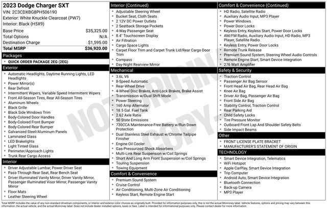 This Dodge Charger is equipped with the following features: Quick Order Package 2EG, Black Cloth, 1-Yr SiriusXM Guardian Trial, 2-Piece Shark Fin Antenna, 276 Watt Amplifier, 4-Wheel Disc Brakes, 4G LTE Wi-Fi Hot Spot, 6 Speakers, 8.4 Touchscreen Display, ABS brakes, Air Conditioning, Alloy wheels, AM/FM radio: SiriusXM, Anti-whiplash front head restraints, Apple CarPlay, Apple CarPlay/Android Auto, AutoStick Automatic Transmission, Brake assist, Bumpers: body-color, Compass, Delay-off headlights, Driver door bin, Driver vanity mirror, Dual front impact airbags, Dual front side impact airbags, Electronic Stability Control, Emergency communication system: SiriusXM Guardian, For Details, Visit DriveUconnect.com, Four wheel independent suspension, Front anti-roll bar, Front Bucket Seats, Front Center Armrest, Front dual zone A/C, Front License Plate Bracket, Front reading lights, Fully automatic headlights, Google Android Auto, GPS Antenna Input, HD Radio, Houndstooth Cloth Sport Seat, Illuminated entry, Integrated Center Stack Radio, Integrated Voice Command w/Bluetooth®, Knee airbag, Leather Shift Knob, Low tire pressure warning, Manufacturer's Statement of Origin, Media Hub (2 USB, AUX), Occupant sensing airbag, Outside temperature display, Overhead airbag, Overhead console, Panic alarm, ParkView Rear Back-Up Camera, Passenger door bin, Passenger vanity mirror, Power door mirrors, Power driver seat, Power steering, Power windows, Radio: Uconnect 4C w/8.4 Display, Rear anti-roll bar, Rear reading lights, Rear seat center armrest, Rear window defroster, Remote keyless entry, Speed control, Speed-Sensitive Wipers, Split folding rear seat, Steering wheel mounted audio controls, Tachometer, Telescoping steering wheel, Tilt steering wheel, Traction control, Trip computer, USB Host Flip, Variably intermittent wipers, and Wheels: 17 x 7 Painted Cast AluminuM. Recent Arrival! 19/30 City/Highway MPG