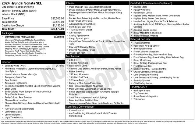 This Hyundai Sonata is equipped with the following features: Convenience Package (12.3 LCD Instrument Cluster, 18 x 7.5J Aluminum Alloy Wheels, Auto-Dimming Mirror, Hyundai Digital Key 2.0 Premium, Leather-Wrapped Steering Wheel, LED Interior Lights, Option Group 02, Panoramic Sunroof, Radio: AM/FM/HD/SiriusXM/Navigation, and Wireless Device Charging), Black Cloth, 17 x 7.0J Aluminum Alloy Wheels, 4-Wheel Disc Brakes, 6 Speakers, ABS brakes, Air Conditioning, Alloy wheels, AM/FM radio: SiriusXM, Apple CarPlay & Android Auto, Auto High-beam Headlights, Automatic temperature control, Brake assist, Bumpers: body-color, Delay-off headlights, Driver door bin, Driver vanity mirror, Dual front impact airbags, Dual front side impact airbags, Electronic Stability Control, Emergency communication system: Bluelink, Exterior Parking Camera Rear, Four wheel independent suspension, Front anti-roll bar, Front Bucket Seats, Front Center Armrest, Front dual zone A/C, Front reading lights, Fully automatic headlights, Heated door mirrors, Heated Front Bucket Seats, Heated front seats, Illuminated entry, Knee airbag, Low tire pressure warning, Occupant sensing airbag, Outside temperature display, Overhead airbag, Overhead console, Panic alarm, Passenger door bin, Passenger vanity mirror, Power door mirrors, Power driver seat, Power steering, Power windows, Premium Cloth Seating Surfaces, Radio data system, Radio: AM/FM/HD/SiriusXM, Rear anti-roll bar, Rear seat center armrest, Rear side impact airbag, Rear window defroster, Remote keyless entry, Security system, Speed control, Speed-sensing steering, Speed-Sensitive Wipers, Split folding rear seat, Steering wheel mounted audio controls, Tachometer, Telescoping steering wheel, Tilt steering wheel, Traction control, Trip computer, and Variably intermittent wipers. Recent Arrival! 25/36 City/Highway MPG